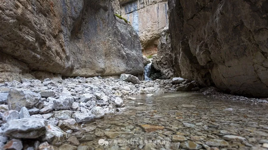 穿过一片岩羊踩过的脚印,是一个一线天式的峡谷,峡谷中有泉水流出。从下图中的小瀑布往上还有一个很大的平台,泉水是从那里面流出来的,因为时间不足和装备不够,没有攀爬到那个平台上去。