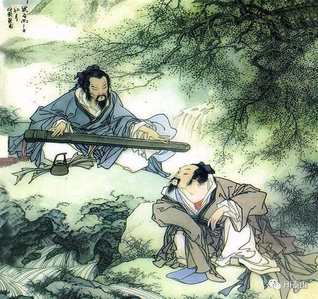 有一日,俞伯牙坐船来到泰山峡口处,遇上了狂风暴雨,船夫速将船摇到一山崖下抛锚歇息,暴雨停后,伯牙见这高山之间的川江有别样的风韵,不禁犯了琴瘾,就在船上借此情景弹奏起来。突然间,琴弦断了一根,抬头一看,就见不远处的山崖上有个樵夫立在那里聆听。俞伯牙见状问到:“小哥怎么会在此处?” 那人答:“小人打柴被暴雨阻于此崖。忽听琴声一片,不觉听上了瘾。”俞伯牙听了非常高兴,又问:“你既然听琴,可知老夫适才弹的是什么曲子?”樵夫说:“大人所弹,乃是您见到山中川江在雨后的感慨,琴声就像那高山一样啊!琴声里我还听到了山间江水流动的声音。”听到樵夫解释后,俞伯牙推琴而起,向樵夫拱手作礼道:“真是荒山藏美玉,今天遍访知音,今得遇小哥,此生心愿已了!我与你知音一回,就把刚才弹一曲起名叫《高山流水》吧!”经询问,俞伯牙得知眼前的樵夫名为钟子期,他与钟子期面对青山作拜,并约定来年春暖花开之际在此聚首。