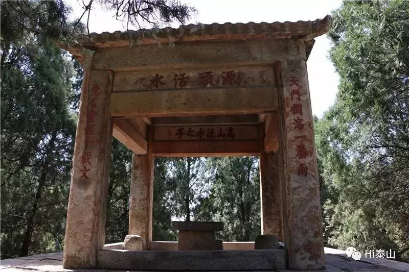 近日,记者跟随红门管理区工作人员来到高山流水亭处,眼前的亭子是全石构造,非常墩壮结实,是典型的北方建筑风格。据了解,高山流水亭通高3.3米,宽2米,为正方形,周边四根石柱,下有四根踢脚石,上面石横梁、插板、脊石横梁各四根,亭顶坡面平缓,顶部有一四方形石脊,亭内横梁上方刻有“高山流水之亭”几字,题于1594年。亭外横梁上方写有“源头活水”,这四个字来源于宋代朱熹的《观书有感》:“问渠那得清如许,为有源头活水来。”