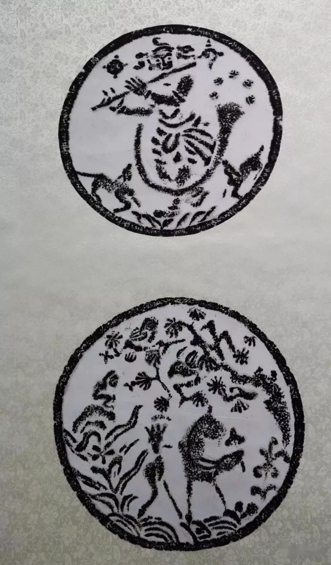 人物故事镜3件。一件直径16.2、缘厚0.4厘米。圆钮,钮上部饰折枝牡丹,牡丹下一方框,钮两侧饰高山悬崖,钮左下方一人盘膝坐于石上,作仰首远眺状,其下饰水波纹,近缘处饰弦纹一周,素宽平缘(图六,1)。另一件圆形带柄,长14.5、宽7.9、缘厚0.4厘米。镜背右侧饰修竹两株,枝叶沿镜缘伸延至顶,上部有祥云、飞鹤,下部一妇人执扇,扇柄指向前面欲作跪拜状的小儿,两人之间饰一兔子,似为“孟母教子”故事。镜柄饰梅、鹿图案(图六,2)。第三件圆形带柄,长19.4、宽9.9、缘厚0.6厘米。镜背右侧站立两人,前面一人宽衣博带,身躯高大似为主人,身后一人身材矮小,手执一物似宝幡,二人身后一株花树伸延过顶;左侧上部饰红日、仙鹤、祥云,其下为水波纹,一龟在波中伸颈昂首似听教诲,近缘处双线纹内饰缠枝纹。镜柄饰流云(图六,3)。以上三件均为1975年晋东南农产品公司拣选。