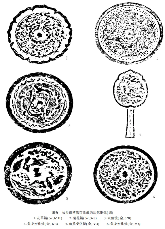 鱼龙变化镜3件。一件桃形带柄,长19.5、宽9.2、缘厚0.6厘米。镜背上部饰祥云托月,下部饰一龙首鱼身展双翼的异兽,在波涛中呈展翅飞跃状,素窄缘。1973年晋东南外贸拣选(图五,4)。另一件直径7.7、缘厚0.5厘米。圆形,桥形钮,镜背饰波浪纹,钮两侧各一龙首鱼身有双翼的异兽在波涛中呈展翅飞跃状,素宽平缘(图五,5)。第三件,直径14.4、缘厚0.6厘米。圆钮,镜背满布波浪纹,波中饰龙首鱼身有双翼的异兽出没其中,素宽缘(图五,6)。以上二件为1980年长治市回收公司大库拣选。