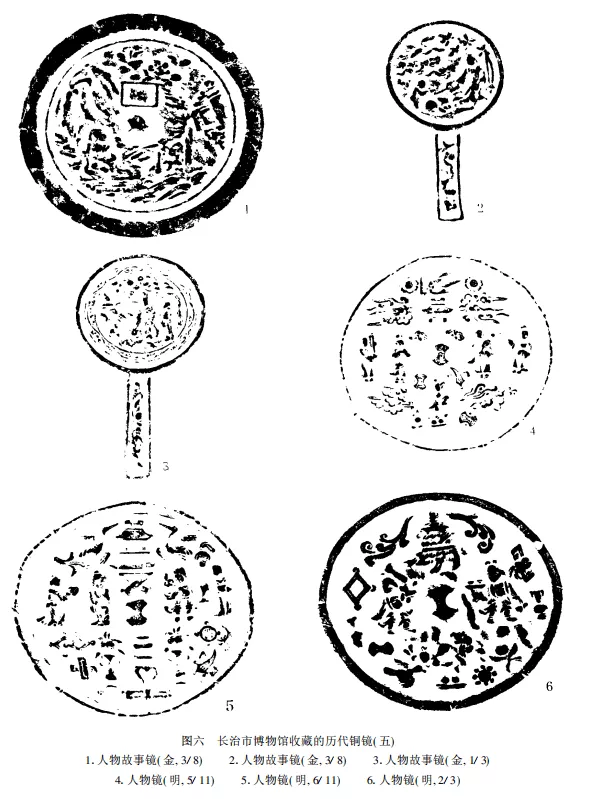 人物镜3件。一件直径11.8、缘厚0.9厘米。银锭式钮,钮两侧各有两宽衣博带人物,钮上部饰亭阁、流云、飞鹤、葵花纹饰,下部饰人物及祥云、犀角、银锭等杂宝图案,窄缘(图六,4)。另一件直径11、缘厚0.9厘米。银锭式钮,钮两侧各有两人似作奉献状,上部饰双鹤与楼阁,下部为香炉、瓶花,此外在镜背空余处饰以方胜、双钱、犀角、艾叶等杂宝,窄缘(图六,5)。第三件直径9.3、缘厚0.6厘米。银锭式钮,钮两侧各一人手托宝盘,上部饰宝幡飘带,下部饰飞鸟、向日葵、狮子滚绣球,镜背空余处饰以方胜、银锭、祥云等杂宝,窄缘(图六,6)。以上三件均为1975年晋东南外贸拣选。