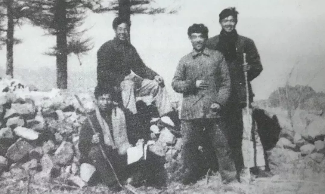 图9 百花山顶的落叶松和来访的人(左起陈海扬、平永泉、钱铭、王东)