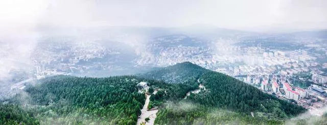 凌空遥望颜山城,楼厦屹立图画中。车辆如梭疾迅驶,路人似蚁蠕动行。青山峻峰掠目过,孝水荡波涤污清。近观石海踩脚下,远听碧霞宮钟声。