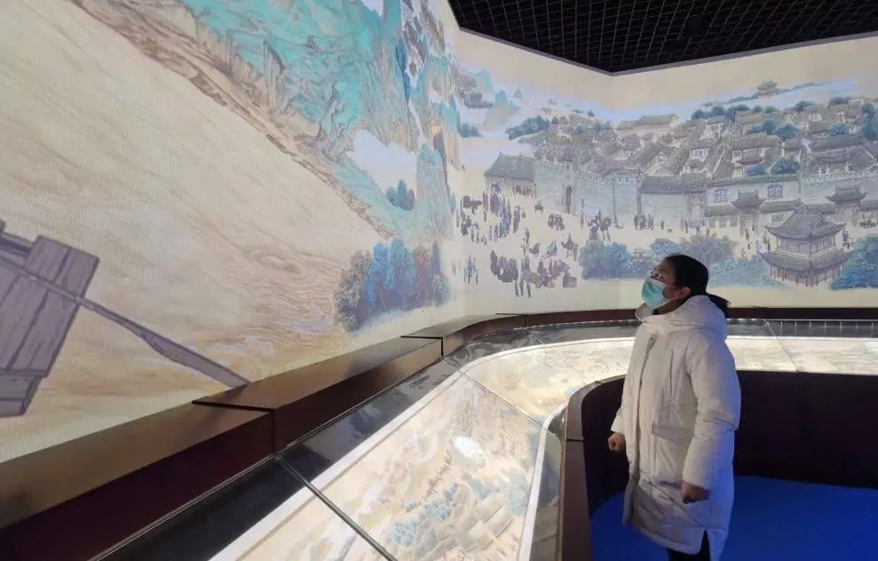 步入这座楼阁式建筑的第二层,一幅手绘“万里茶道”映入眼帘,灯光照拂的画卷上,马嘶驼铃响,市井街道上,百姓称茶送茶,晋商马帮鱼贯而上,房屋、桥梁、船只、山峦,颇有清明上河图的美感。游客还可触及下方的“提示按钮”,文字介绍就会跃然画卷上。