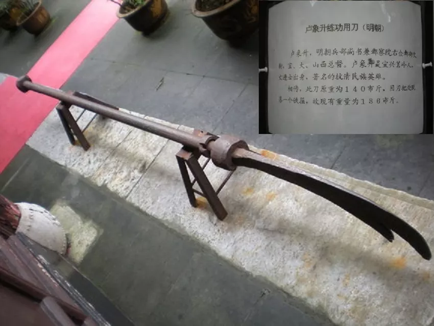 卢象升练功刀。卢象升是明末抗后金名将,天生神力,善用大刀,有万夫不当之勇,人送外号“卢阎王”。卢象升用的作战大刀多少斤无考,他的一把练功大刀陈列在江苏省无锡宜兴市宜城街道的“卢忠肃公祠”内。这把刀原重140斤,因脱落一铁环,现重136斤。卢象升用这么重的刀练功,可见他力大过人。在巨鹿贾庄战斗中,明军被数万清军包围。卢象升指挥兵将打完最后一炮,舞动大刀冲入敌阵,斩杀数十清兵清将,他身中四箭三刀,仍然大声疾呼:“关羽断头,马援裹革,在此时矣!”最后,卢象升鲜血流尽,力竭战死。