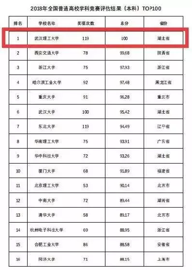 2018年,武汉理工大学更是以119次奖项,总分100分的成绩,拿下了《2018年全国普通高校竞赛排行结果(本科)榜单》的桂冠。