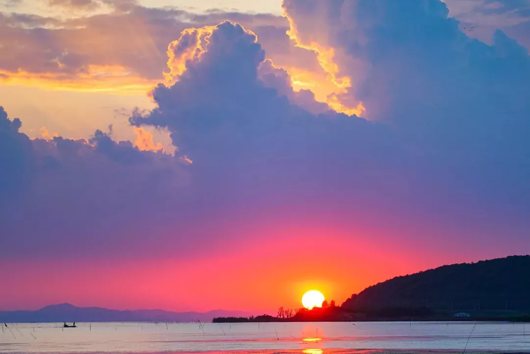当一丝微弱的红点终于爬上了天边,刹那间变得耀眼无比,将湖面投射得波光粼粼,你像身穿金色长裙的少女,在湖边跳着一支名为日出的舞蹈。