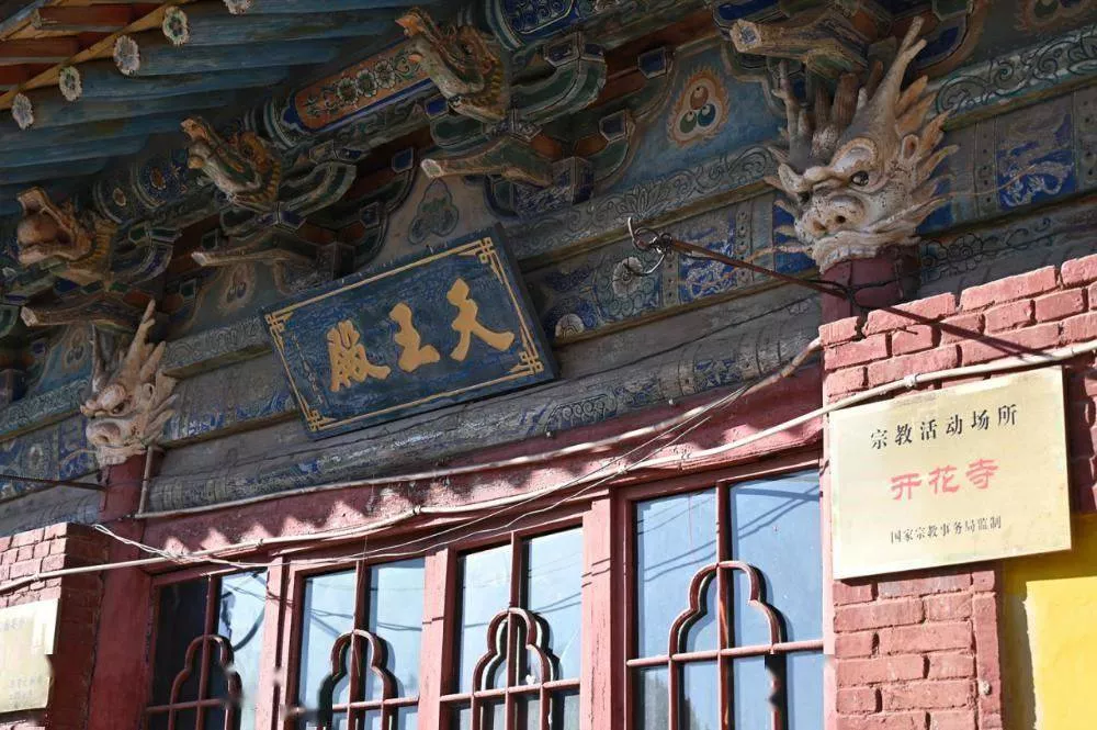 辛庄开化寺,坐北朝南,二进院落布局,南北长37.14米,宽25.88米,占地面积961.18余平方米。中轴线上建有过殿、正殿,两侧有东西配殿。主要建筑有大雄宝殿、观音殿、地藏殿、东西垛殿、天王殿、斋堂、厢房等。