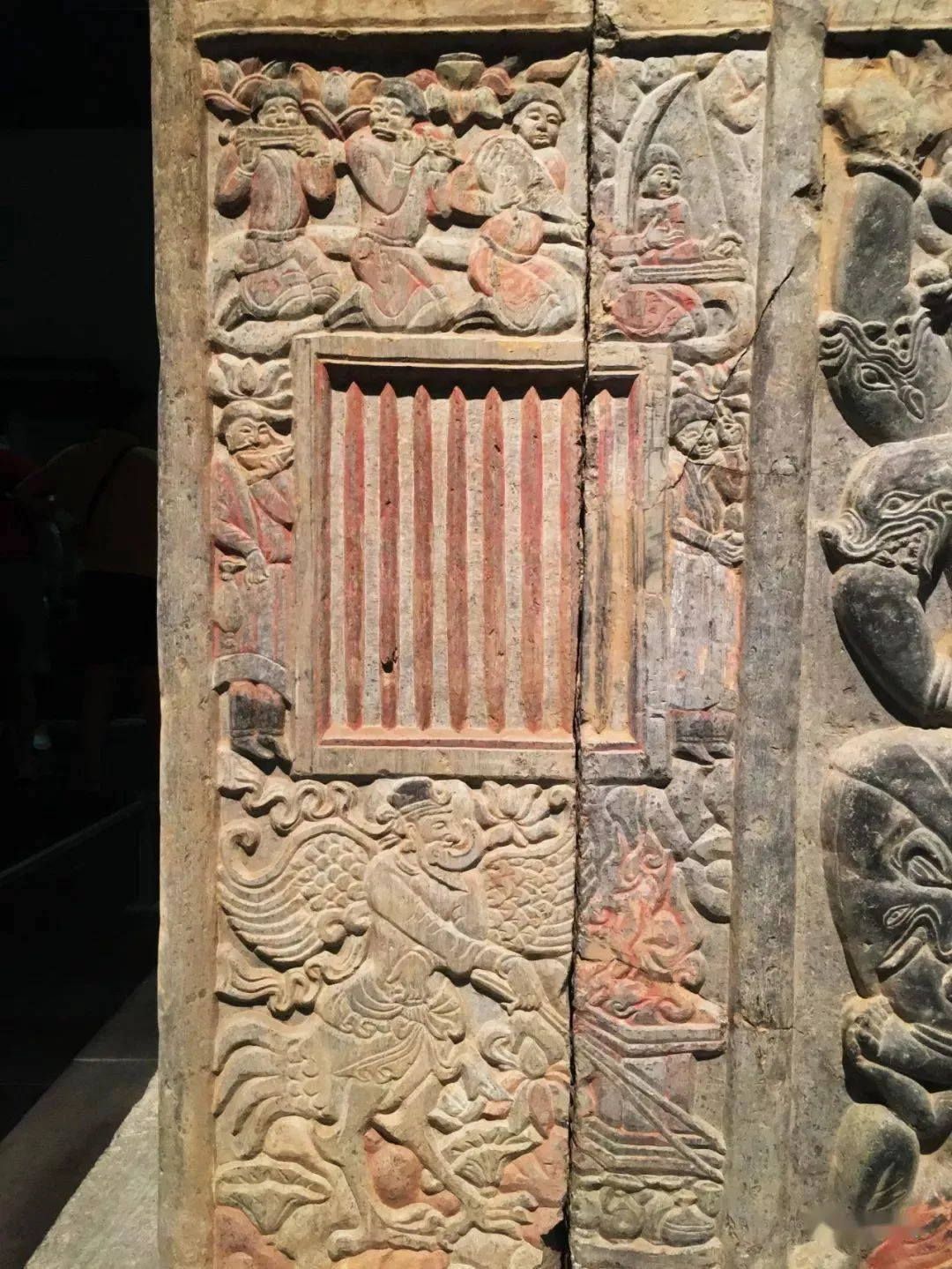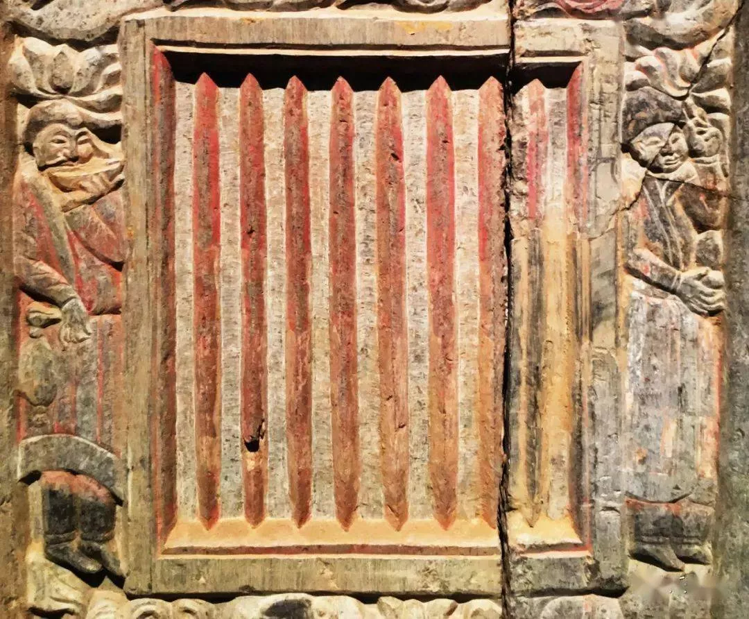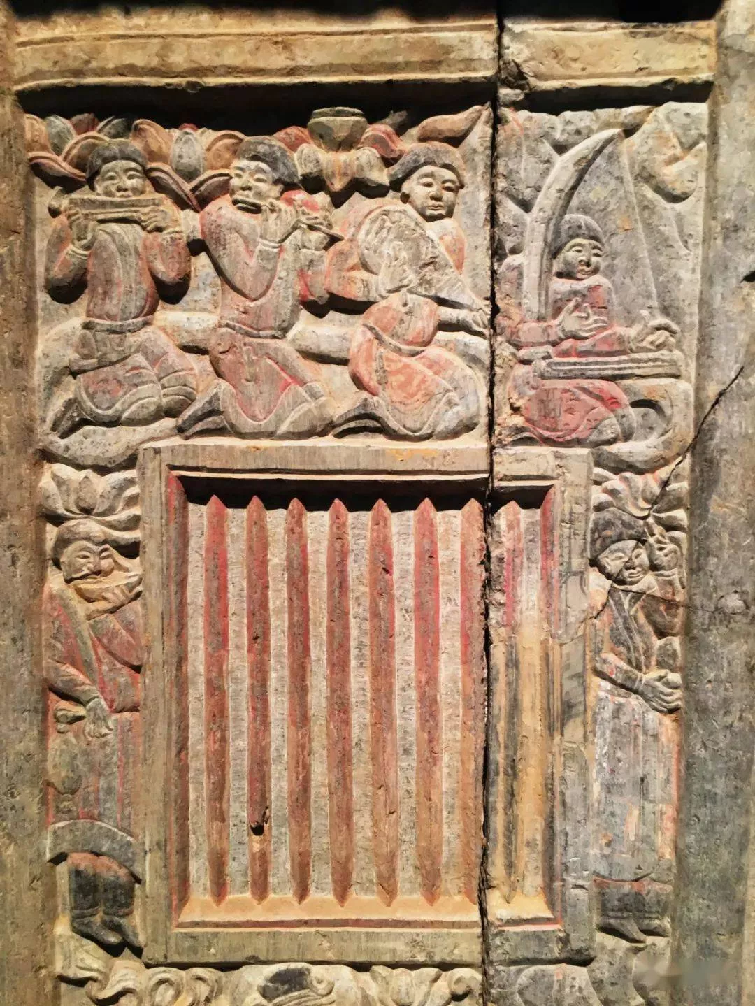 最外侧对称的是直棱窗,直棱窗上分别刻有伎乐,下刻人身鹰足的穆护,手持火棍,前面分别放有两个祭祀用的火盆。