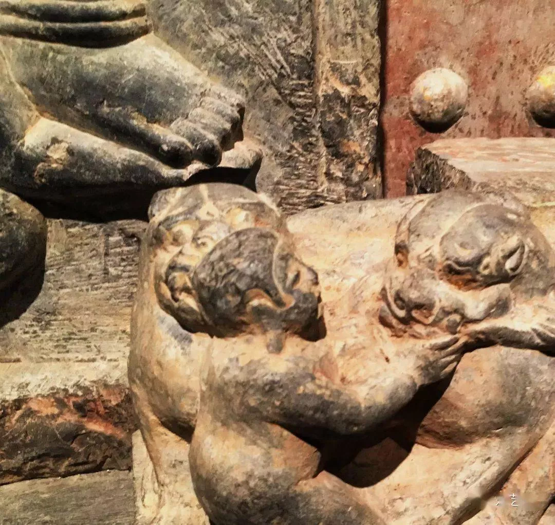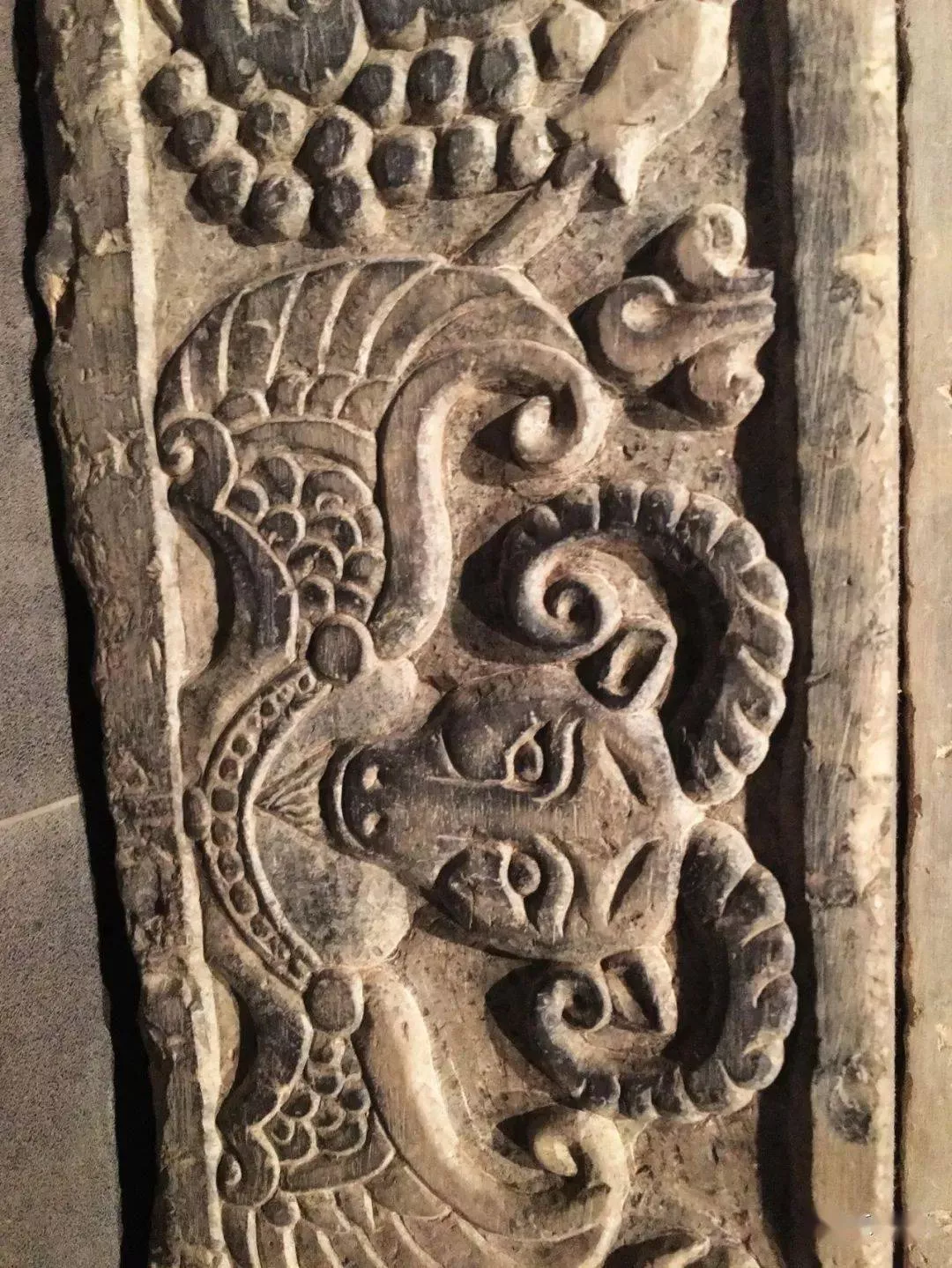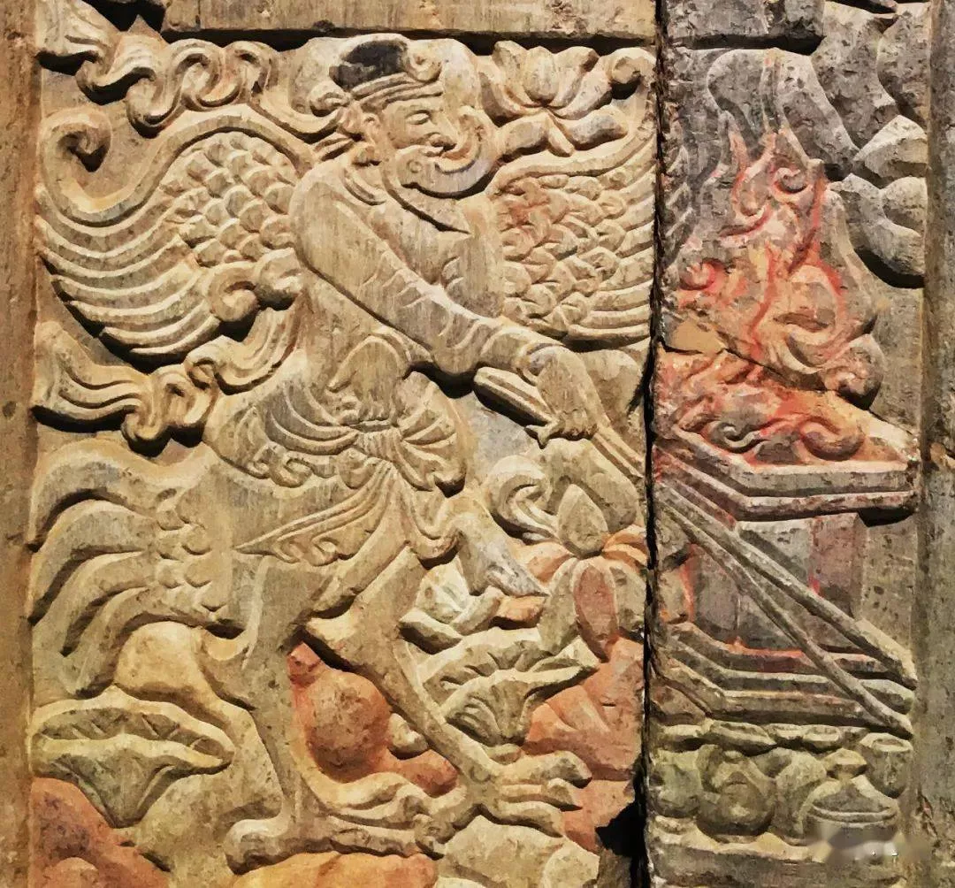 最外侧对称的是直棱窗,直棱窗上分别刻有伎乐,下刻人身鹰足的穆护,手持火棍,前面分别放有两个祭祀用的火盆。