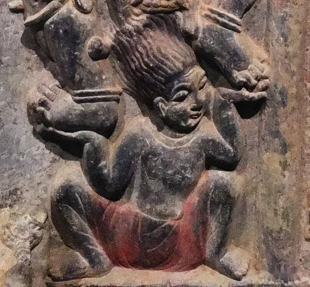 正中间为两扇石门;门上为一块整石,刻有粟特文和汉文译文;门两侧为脚踏小鬼的四臂守护神,雕刻手法采用高浮雕,十分醒目;