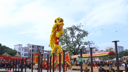 而在当日的重头戏----狮王争霸邀请赛上,锣鼓声节奏分明、铿锵有力,高桩上的狮子威风凛凛,时而快速奔跑,时而双脚直立,时而夹腰倒挂,惊险的动作都是在小小的高桩上完成,但舞狮运动员却是如履平地。高超的技艺,让观众大呼过瘾,一阵阵热烈的掌声和欢呼声经久不息。