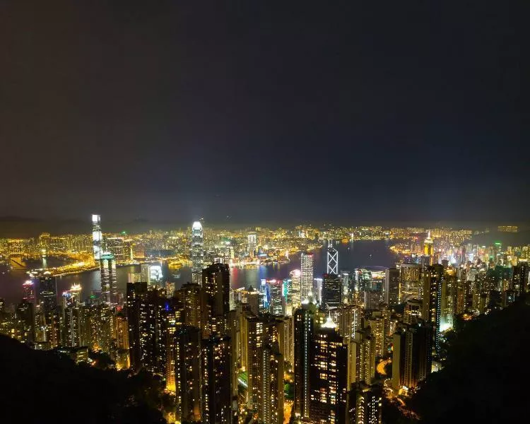 俯瞰夜色下的维多利亚海港,岛区层层叠叠,密密麻麻的摩天高楼。灯光璀璨。