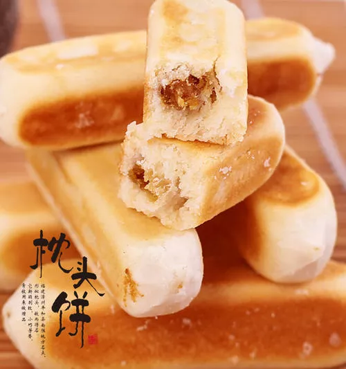 枕头饼是漳州平和县一种非常地道的名点小吃,属于茶料甜点,是漳州八大名点之一,因做好的枕头饼,外形长条状,有一寸八分长,大小与小指头相近,形似古时睡觉枕头,故而得名。枕头饼历史悠久,早在明万历年间曾被列为贡品,选料精细,配制独特,它选用精面粉、优质猪油、白冬瓜条、精白糖上饴和山柑、炸油葱等原料配制而成。其特点是新颖别致,小巧芳香,吃起来酥脆清甜、香软可口,一直是当地民众逢年过节的必备茶点和馈赠远方亲友的特色礼品。除了枕头饼,漳州八大名点还包括手抓面、卤面、面煎馃、双糕润、蚵仔煎、猫仔粥、烧肉粽等。