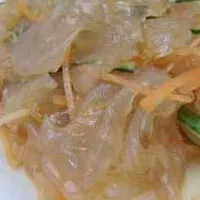 凉拌海蜇 浙江 凉拌海蜇,是舟山的特色小吃,是一道夏日凉菜。凉拌海蜇制作简单,所有调味料放入小碗中拌匀制成调味汁备用,海蜇洗净切丝,用热水快速焯一下,捞出过冰水备用,胡萝卜、黄瓜洗净切丝,香菜洗净切末,把所有食材放入碗中,淋上调味汁,拌匀即可。海蜇凉拌后,质脆而韧,清凉爽口,是常用的佐酒佳肴。中文名:凉拌海蜇分类:家常菜口味:甜主要食材:海蜇皮调料:盐,味精做法:凉拌