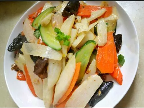 安顺炒山药 安顺炒山药是安顺一道地方特色菜,选用安顺本地特产安顺山药,通过煎炒,再加入青辣椒、西红柿姜丝、蒜粒、面酱等制作而成。安顺山药是安顺著名的特产,为农产品地理标志产品,以之作菜,本应入药膳之列,然发扬光大推陈出新的安顺人,却将之做成了饮誉一方,风味独特的系列家常菜,除了煎炒外(脆皮山药、炒山药片),还有烩山药、山药汽锅鸡、山药炖鸡、山药炖肚条等特色菜。