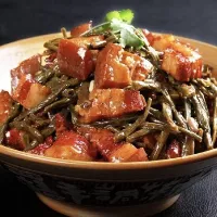 干豆角烧肉 安徽 • 池州 • 贵池 干豆角烧肉,是安徽省池州市的传统特色美食。这道菜以干豆角、五花肉为主要食材,配以生姜、大葱、蒜瓣、白糖、干辣椒、酱油、绍酒、八角、桂皮、花椒等调料,大火烧开后,转成小火炖制,至干豆角软烂,然后加盐调味,大火收汁,出锅前加适量鸡精提香即可。中文名:干豆角烧肉分类:徽菜口味:咸鲜可口主要食材:干豆角,五花肉菜系:徽菜配料:蒜、姜、葱、白糖、干辣椒等等