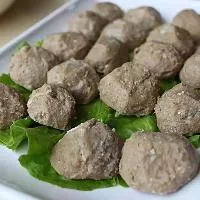 汕头牛肉丸 广东 • 汕头 • 龙湖 牛肉丸的制作一定要选用新鲜的牛腿包肉作料,去筋后切成块,放在大砧板上,用特制的方形锤刀两把(重量3公斤左右),上下不停地用力把牛腿肉槌成肉浆,加入少量雪粉、精盐、上等鱼露和味精,继续再槌15分钟,随后用大缽盛装,加入方鱼末、白肉粒和味精,拌匀,用手使劲搅挞,至肉浆粘手不掉下为止,然后用手抓肉浆,握紧拳挤成丸,用羹匙掏进温水盆里,再用慢火煮丸约8分钟,捞起牛肉丸。中文名:汕头牛肉丸外文名:Shantou beef ball分类:潮菜安全地方标准:广东省食品安全地方标准汕头牛肉丸