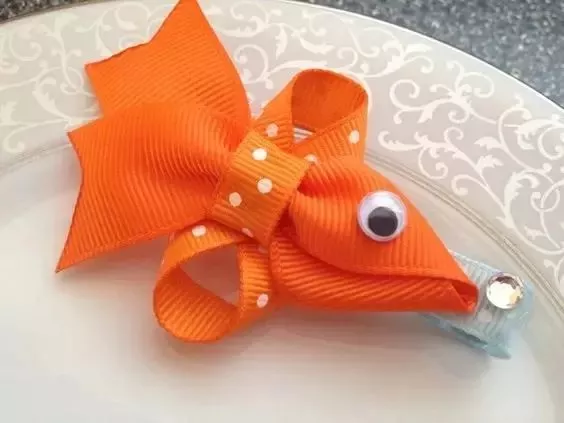 3.再剪两小段黄色彩带,弯起来,贴在鱼鳍的位置。