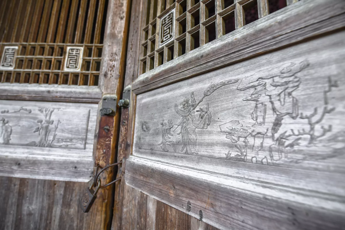 木雕则以门枋、牛腿等为主。千柱屋的木雕丝毫不逊色于砖雕。门窗均为格扇式,分别用梅兰竹菊、吉祥如意、缠枝花卉等图案,大的盈尺,小的寸许,内容丰富,各具寓意,美不胜收。