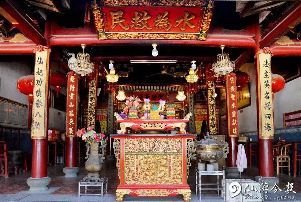 圣泉祖殿历史悠久,代有修葺,清道光癸已年(1833年),里民林有惠捐资重建,其规模基本定局。宫殿模式,庄严堂皇。地处盆地,群山含翠,秀水环流,环境奇丽。后远靠大蜚山,稳如泰山;前峰雄鹰展翅,狮象保口;西有飞凤衔书,九龙抢珠;东连笔架山,八仙过海,日月辉映。宫殿坐北向南,五间两进,穴号飞蝶,中间三间为“金桶”、“四窗”、十八对柱之石土木结构。两边上下为厢房,廊前一对石柱,镌刻清名家手书“灵山不远,惠水常流”对联。宫前遗有仙妃祭法所用“文房四宝”,石皿法器,天然妙成。其中“水池”,系后唐代古水井,患者在井中吸水饮服,有水到病除之效,曾有“飞蝶苏命”之誉。宫庭前方为文化广场,文化戏台、老人文化活动中心和仙妃亭;左侧有法主仙妃手植的一棵古樟,主干需十多个成年人才能合抱,树龄1108岁,现列为“福建省一级古树名木”。宫的右侧还有仙妃祭法引泉的井亭边井、庐陂桥下井、大龙井等七井泉脉,依然福泽万民。