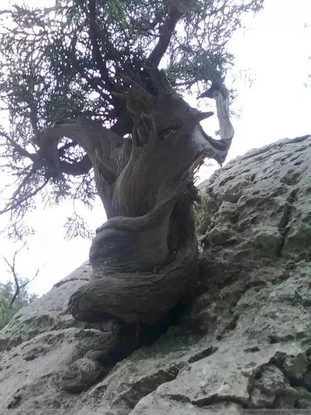 第一,外形。要从外形来判断,崖柏的根是扁的,其他柏树的根是圆的,因为崖柏的根是长在岩石的缝隙中的。崖柏的树和枝或弯曲旋转,或瘤,或枝杈很多。