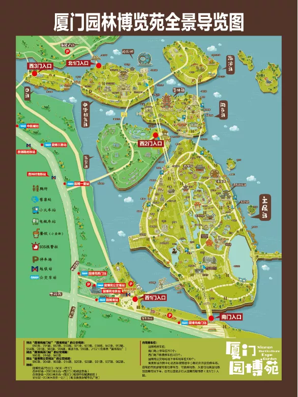 4月24日起,园博苑开放 南门(毗邻集杏海堤)、 西一门(毗邻地铁1号线园博苑站2号出口)、 西二门(毗邻温泉岛)、 西三门(毗邻中航城居住区)、 北一门(毗邻集美新城市民广场)五个出入口,并在主要入口设置服务点,提供园内交通工具售票、咨询寄存服务,便利游客。