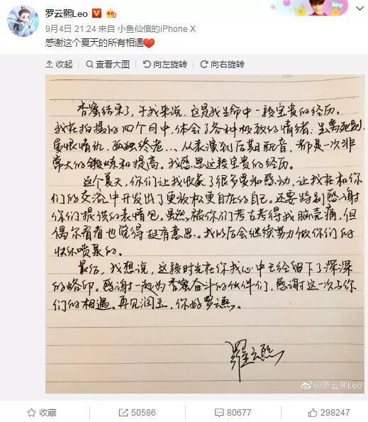 在《香蜜沉沉烬如霜》大结局之后,一众演员都发了微博,润玉罗云熙手写的感谢信;