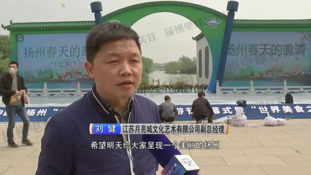 江苏月亮城文化艺术有限公司副总经理 刘健:我们舞台的搭建灯光以及其他一些各项的调试,已经进入最后的环节,希望明天给大家呈现一个美丽的扬州。