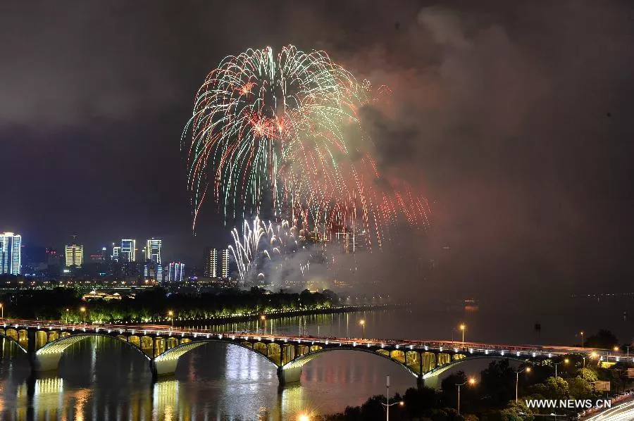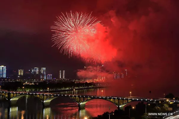Photo taken on May 16, 2015 shows fireworks in the sky over the Juzizhou Bridge in Changsha, capital of central China's Hunan Province. A musical firework show was held in Juzizhou on Saturday night. [Photo: Xinhua/Long Hongtao]