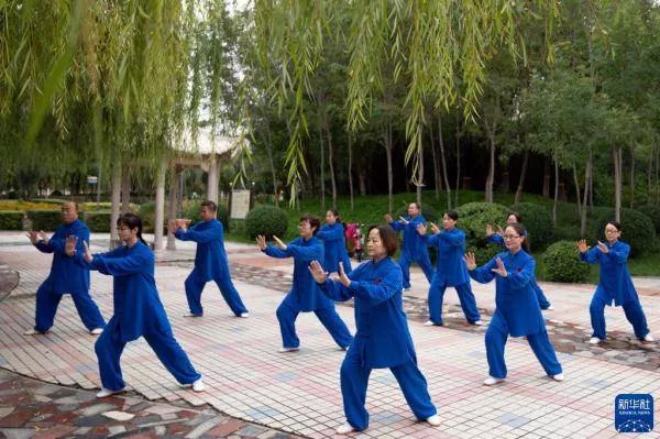 10月10日,市民在黄骅市文星湖公园练习太极拳。