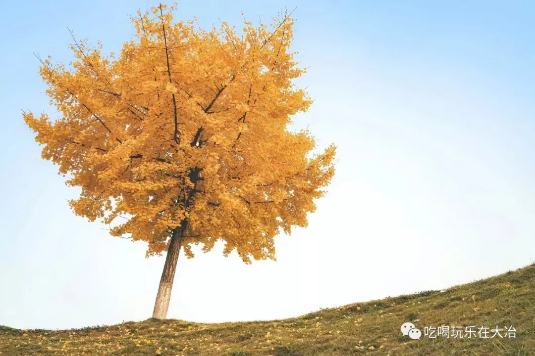 蔚蓝的天空下一棵黄橙橙的银杏孑然挺立,不仅联想起《山楂树下》的浪漫。“大冶黄”如昙花一现般稍纵即逝,错过这一片银杏的小伙伴们只能等来年春天咯。