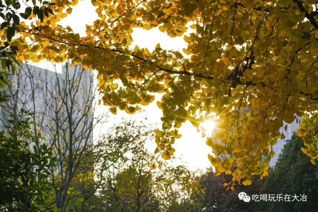 黄色本是秋天的代表,在大冶,秋天印象最深刻的就是公园的银杏树。枯黄的银杏叶铺满一地,像献给大地的华丽礼服,引得无数大冶摄影爱好者去打卡。