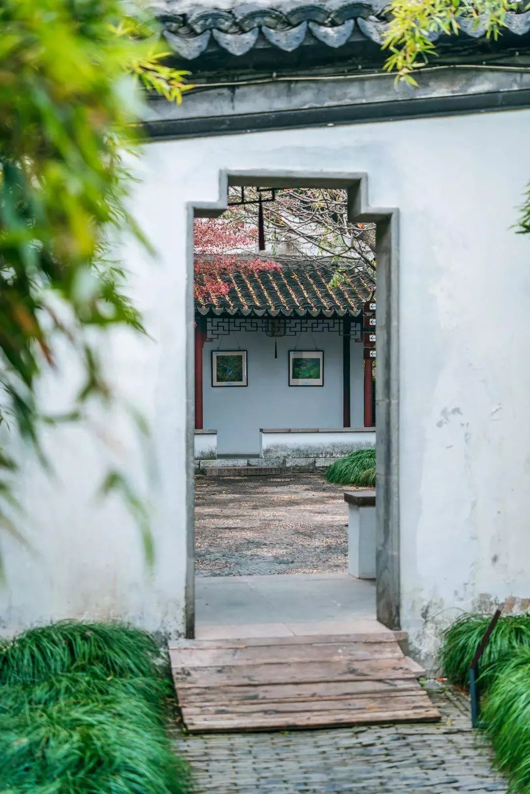 白墙白雪红柱,好一副精致的中国古典美景。