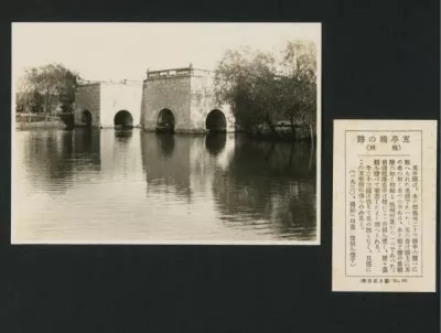 此外,《亚细亚大观》中收录了一张五亭桥照片,旁边附一段日文说明,写道:“五亭桥是扬州二十四桥中屈指可数的名桥。桥如其名,由五座亭子组成,水、树、楼像风景画一样错落有致,只要提到扬州的美景,它必定位列其中。传说清朝乾隆皇帝特别喜欢这座奇桥,多次乘坐画舫来此游览。如今其他的二十三座桥都已毫无踪迹可寻,仅仅留存这座五亭桥矗立在那。”可见,五亭桥在民国时期就已经闻名海内外。
