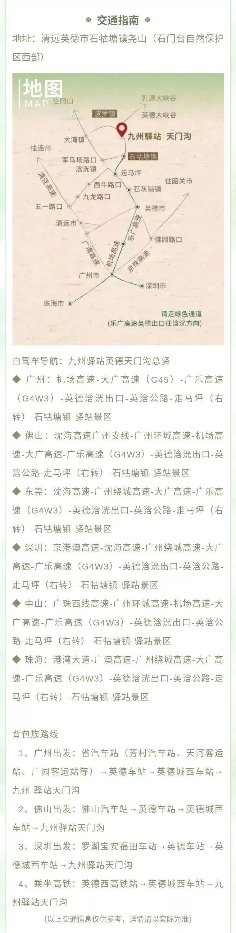 1、东线:京珠高速→佛冈→佛英一级→英德→英浛公路→走马坪(右转)→石牯塘镇 →驿站景区(全程170公里;耗时2.5小时内,路况最好)