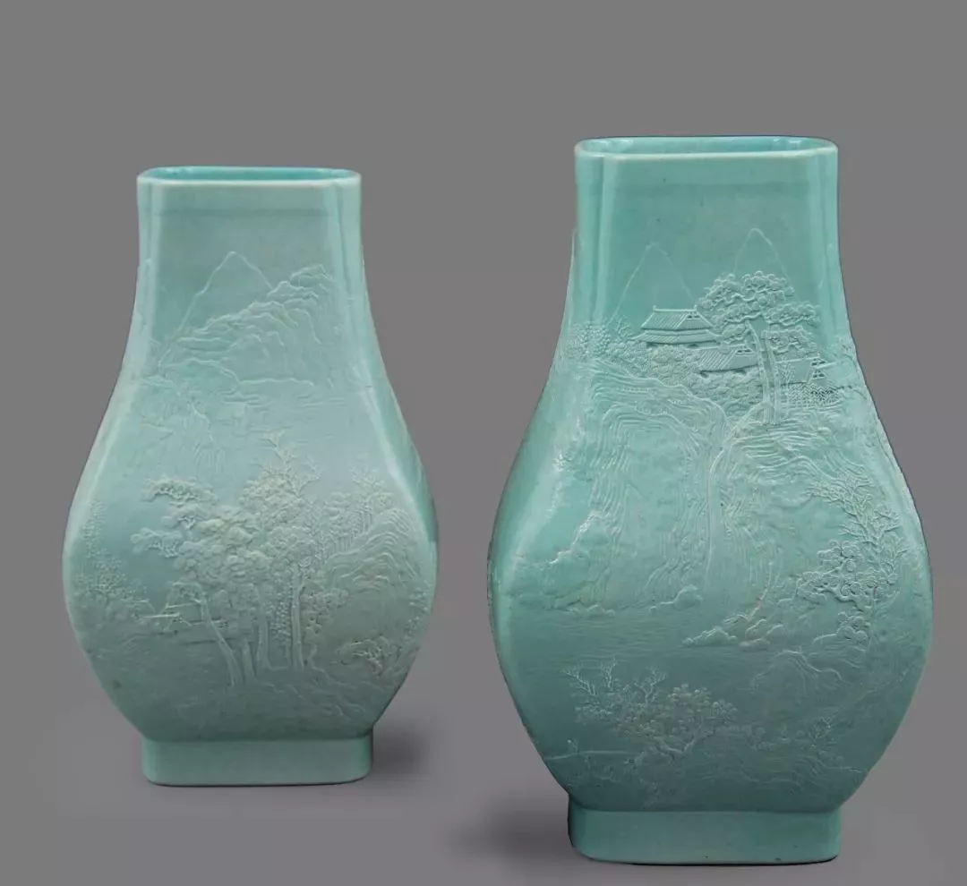 清道光 秋葵绿釉雕瓷山水纹方壶一对