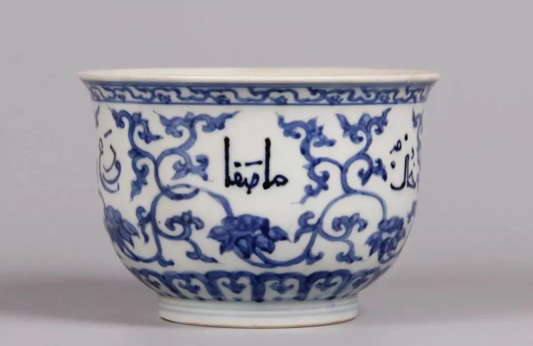 目前,金立言收藏有数十件正德官窑,而这件一件器身绘缠枝莲托阿拉伯文字一周,下置莲瓣纹,底双圈双行“大明正德年制”楷书款,传世类品罕见,目前只见有一例藏于北京故宫博物院。