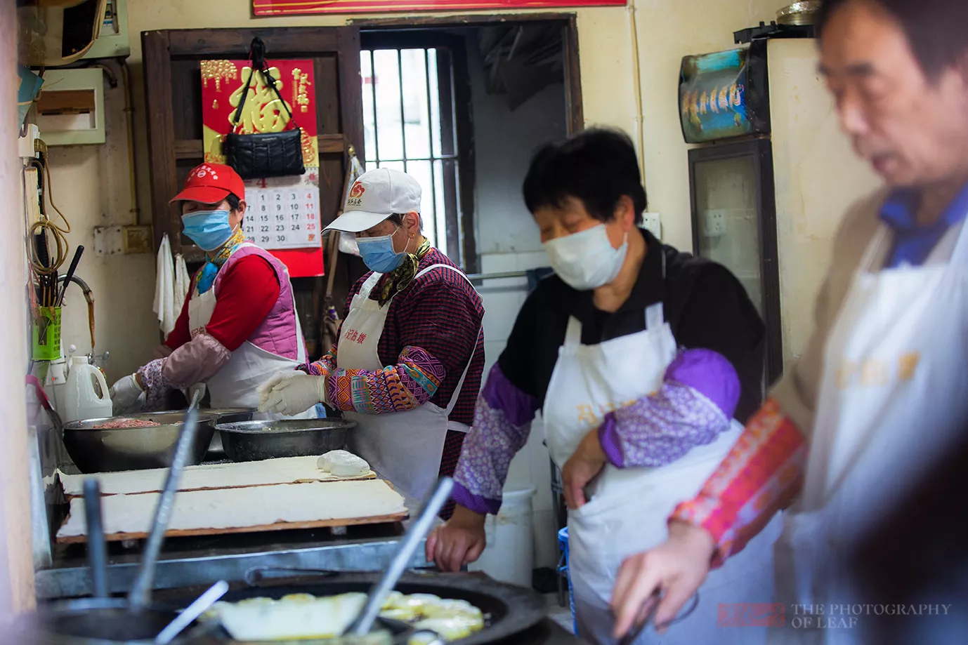 一间十多个平方的沿街小店,里面除了一些普通的设备,就剩下站人的位置了。店内有六个工作人员,两个包油墩,两个炸油墩,还有两个负责卖油墩。此时外面顾客排起了很长的队,油墩制作已经有点跟不上了,很多人只能等着下一锅出炉。