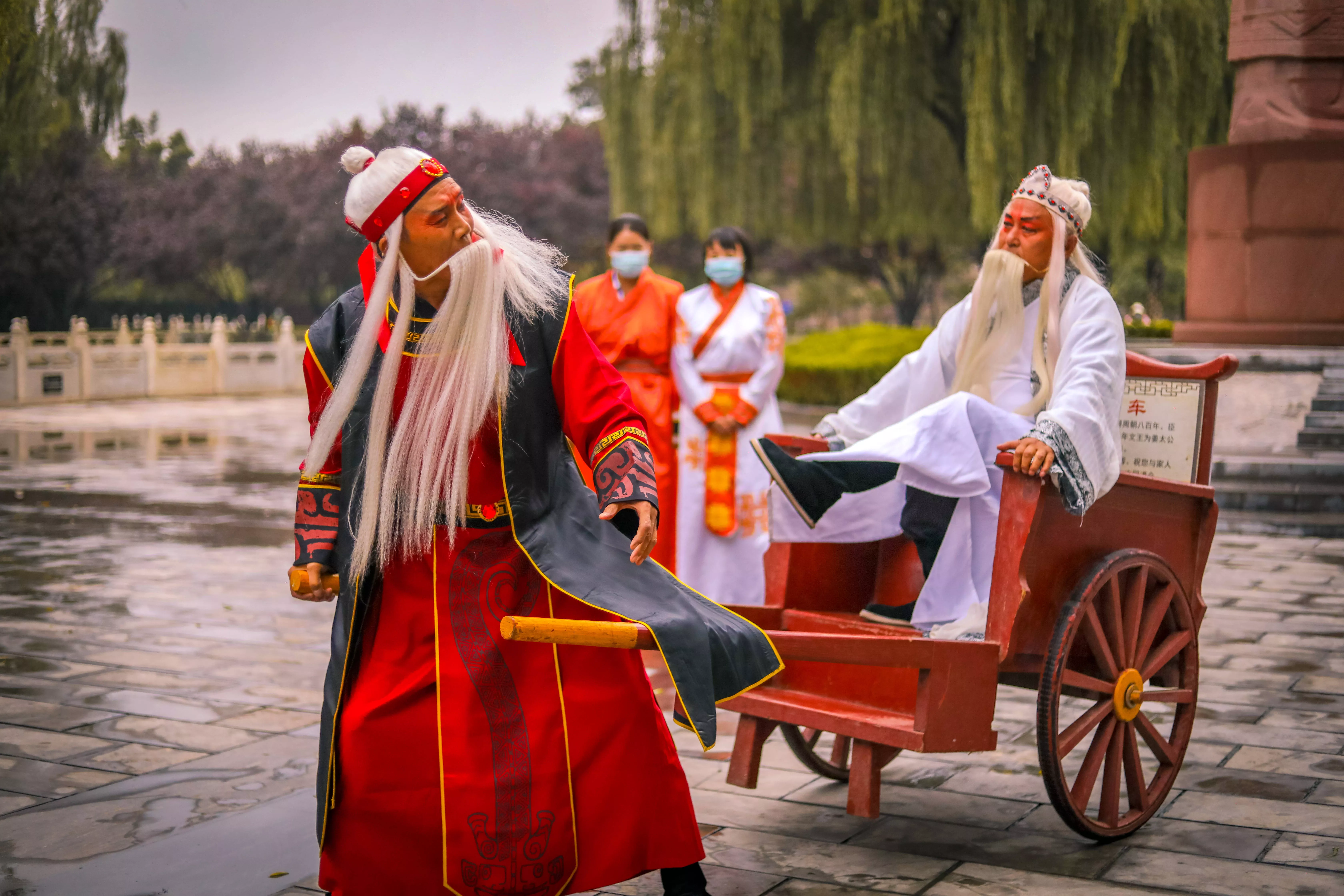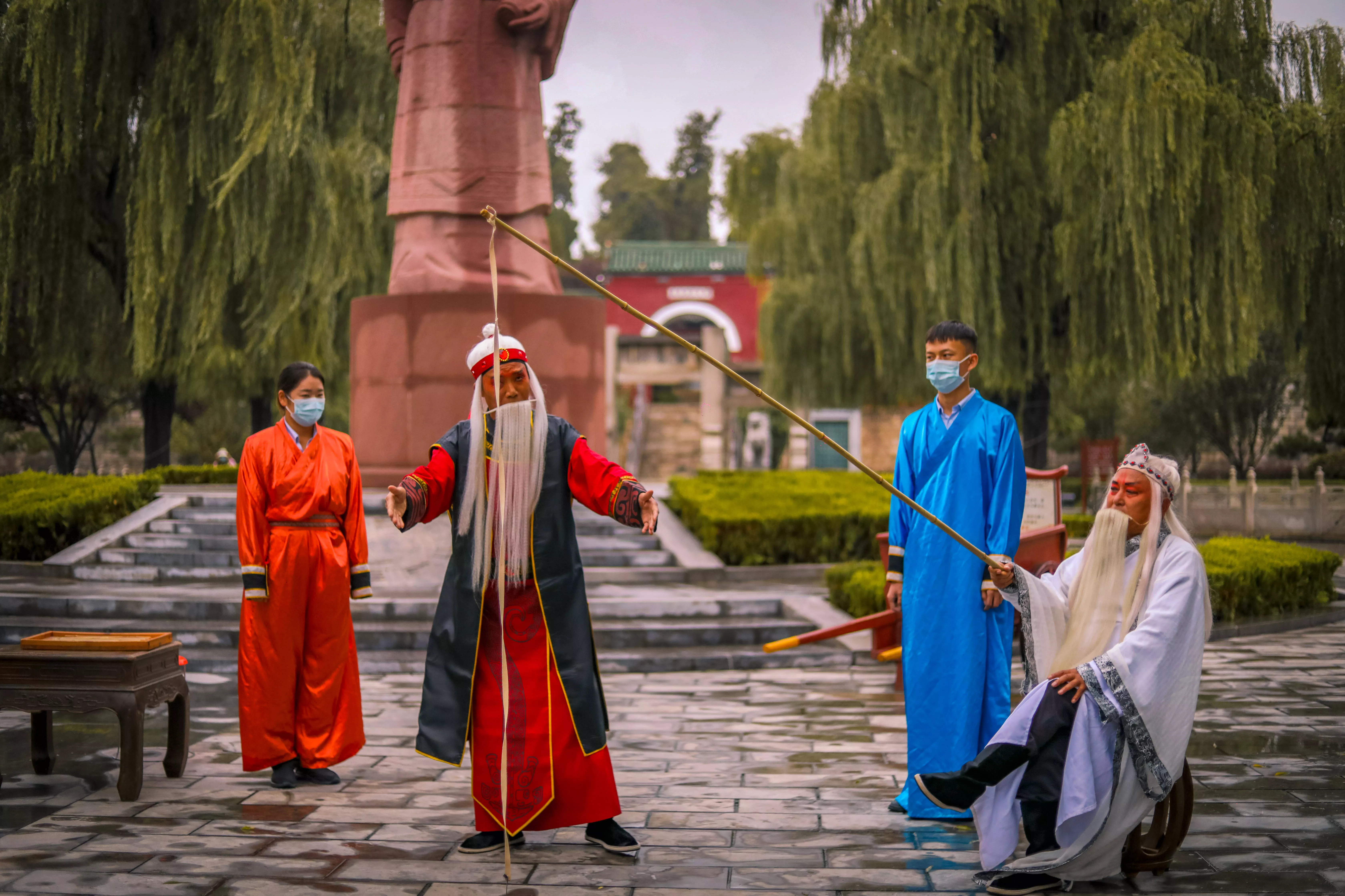 羑里城的工作人员真是很有爱的一个团体,为了更加真实形象地诠释出周文王求贤若渴的经典桥段,由员工扮演的周文王和姜子牙,穿上戏服,声情并茂地给游客深情演绎了一段“文王拉车八百步,大周江山八百年”的历史典故,让每一个在场的观众都为之动容。