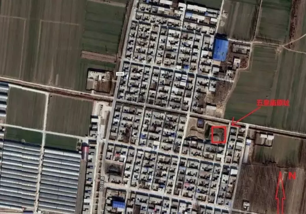 五皇庙完全拆除时,规模为占地面积约400平米的长方形院落,南北长约30米,东西宽约14米,约等于现后姜村所规划的1.4个居民院落的大小。五皇庙院落只有一扇朝西开的庙门,为道教风格的砖制拱券门,高约2.2米,宽约1.5米,门槛高于地面,内外分有石阶数级。
