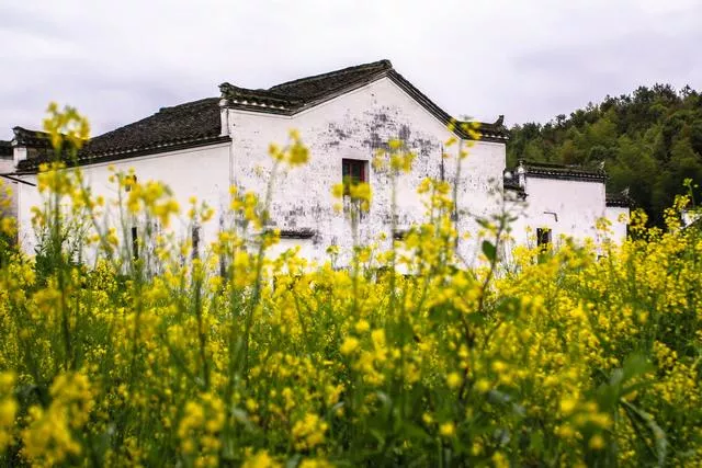 毫不讲理的浓郁的油菜花黄,典型的白墙黛瓦徽派建筑,错落在一片片灿烂的花海中,远处重峦叠嶂的山,眼前弯弯曲曲的水,一动一静,动静相宜。