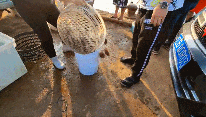 9月1日15时30分左右,第一艘渔船靠岸。渔民表示,出海第一天主要是试试机器和网具,所以只下了两网就往回返,主要是黄海胆和少许杂鱼。渔民一卸货,就有许多市民和饭店店主来挑选,“这几条大的黄鱼我要了。”还没等海鲜筐落地,有的海鲜就有主了。这个季节黄海胆肥美,海胆小的5元一个,大的15元两个,两大筐海胆很快就卖光了。