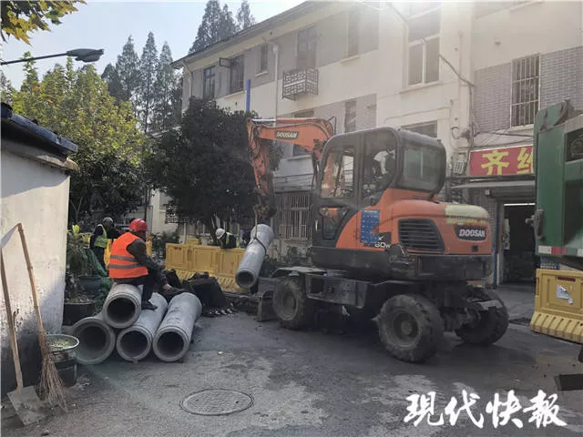 11月10日上午,现代快报记者进入御道街小区,在离大门不远处左拐,记者看到一个大吊车正吊着水泥管缓缓放入地下。地面上挖出了一条长近十米、深一米左右的沟道。