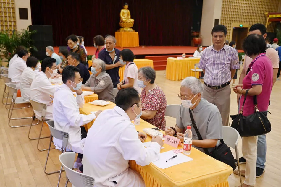 此外,上海玉佛寺、上海觉群文教基金会联合上海第九人民医院、上海觉群中医,在觉群楼二楼(万佛堂)开设重阳敬老义诊。重阳节当日入寺礼佛的65周岁以上老人,都可凭身份证或敬老卡参与现场义诊。图为:老人在玉佛寺万佛堂接受义诊。