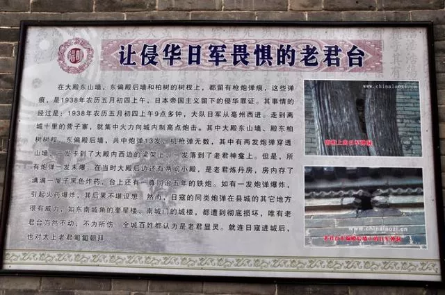 然而,日寇的同类炮弹在县城的其它地方很有威力,如东南城角的奎星楼、南城门的城楼,都遭到日军彻底损坏,唯有老君台岿然不动,不为所伤。