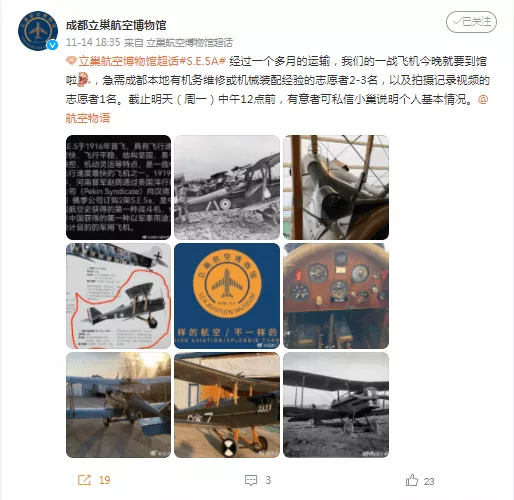 称“经过一个多月的运输,我们的一战飞机今晚就要到馆啦。急需成都本地有机务维修或机械装配经验的志愿者2-3名,以及拍摄记录视频的志愿者1名。截止明天(周一)中午12点前,有意者可私信小巢说明个人基本情况。”