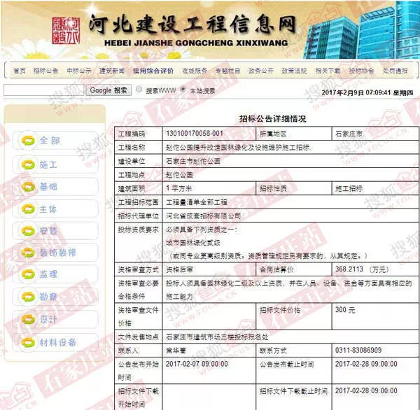 此外,招标信息中还显示,石家庄市赵佗公园园林绿化及设施维护施工,计划开工日期2017年3月10日,计划竣工日期2017年6月9日。