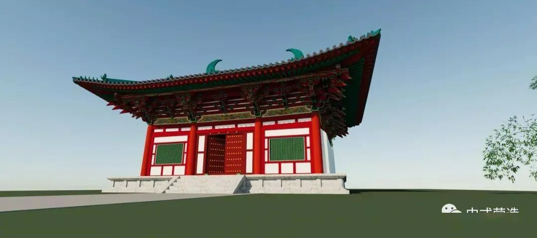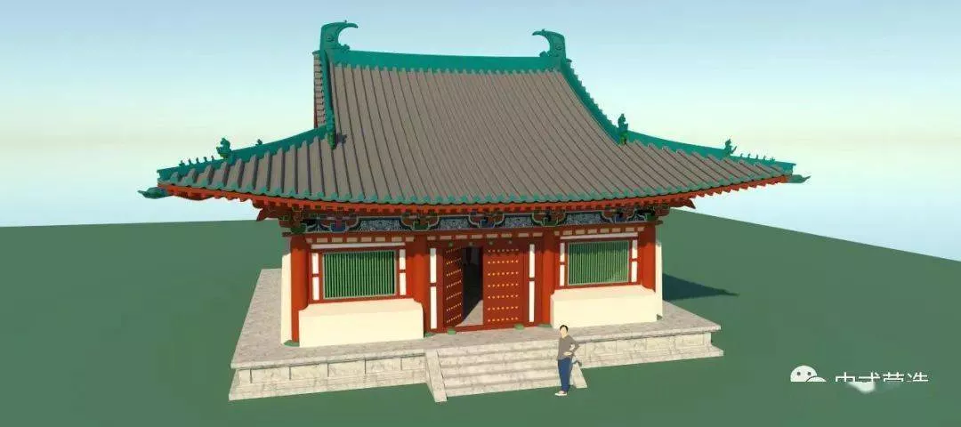 在仅有的几座五代时期的遗构中,有两座三间小殿颜值极高,这就是平遥镇国寺万佛殿和平顺大云院弥陀殿。于是尝试用SU仿制了两个模型,使用THEA渲染器稍作渲染。预设原有脊,鸱尾,垂兽,戗兽及蹲兽应是琉璃或三彩烧制,颜色类似松石绿,或国画颜料石绿。彩绘仿太原新建的太山龙泉寺仿唐建筑群。